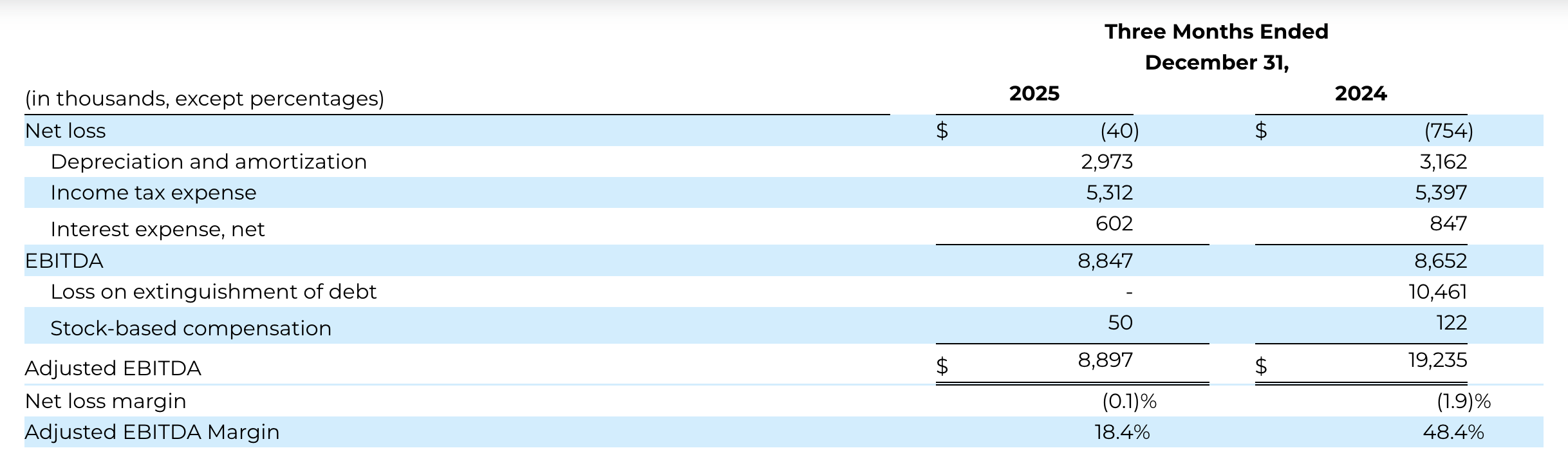 - Adjusted EBITDA: $5.7 million, compared to $33.7 million in 2024.
