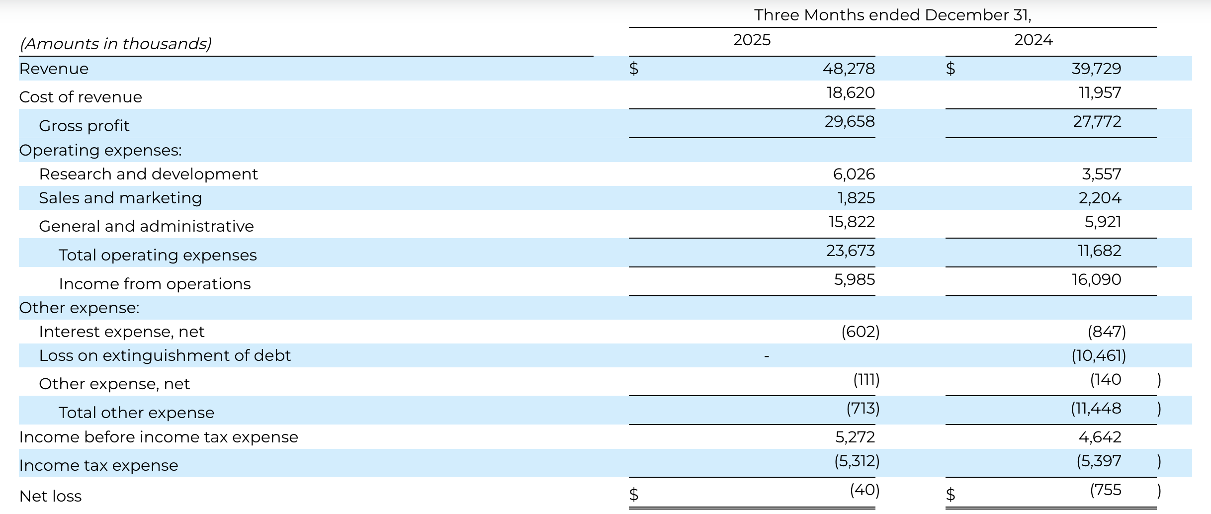- Revenue: $48.3 million, compared to $39.7 million in the fourth quarter of 2024.