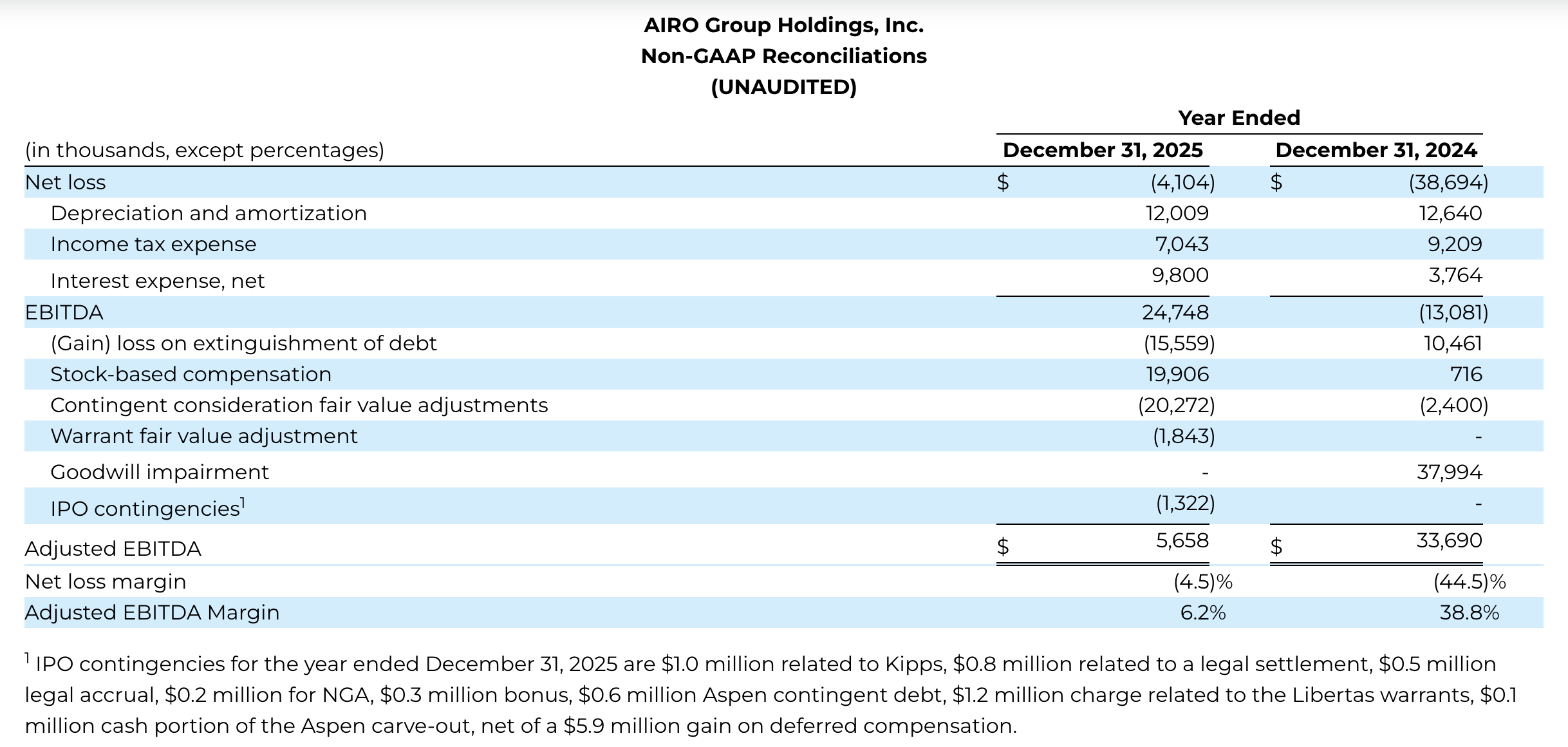 To supplement its condensed consolidated financial statements prepared and presented in accordance with GAAP, AIRO uses EBITDA, Adjusted EBITDA and Adjusted EBITDA margin, as described below, to facilitate analysis of its financial and business trends and for internal planning and forecasting purposes. AIRO defines (1) EBITDA as net income (loss) before interest expense, income tax expense (benefit), depreciation and amortization, (2) Adjusted EBITDA as net income (loss) before interest expense, income tax expense (benefit), depreciation and amortization, loss (gain) on extinguishment of debt, stock-based compensation, contingent consideration and warrant fair value adjustments, goodwill impairment and other one-time adjustments related to the IPO and (3) Adjusted EBITDA margin as Adjusted EBITDA divided by revenue. The above items are excluded from EBITDA and Adjusted EBITDA because these items are either non-cash in nature, or because the amount and timing of these items is unpredictable, or because they are not driven by core results of operations, thereby rendering comparisons with prior periods and competitors less meaningful. AIRO believes EBITDA, Adjusted EBITDA and Adjusted EBITDA margin provide useful information to investors and others in understanding and evaluating its results of operations, as well as provides useful measures for period-to-period comparisons of its business performance. Moreover, Adjusted EBITDA is a key measurement used by AIRO management internally to make operating decisions, including those related to analyzing operating expenses, evaluating performance and performing strategic planning and annual budgeting.